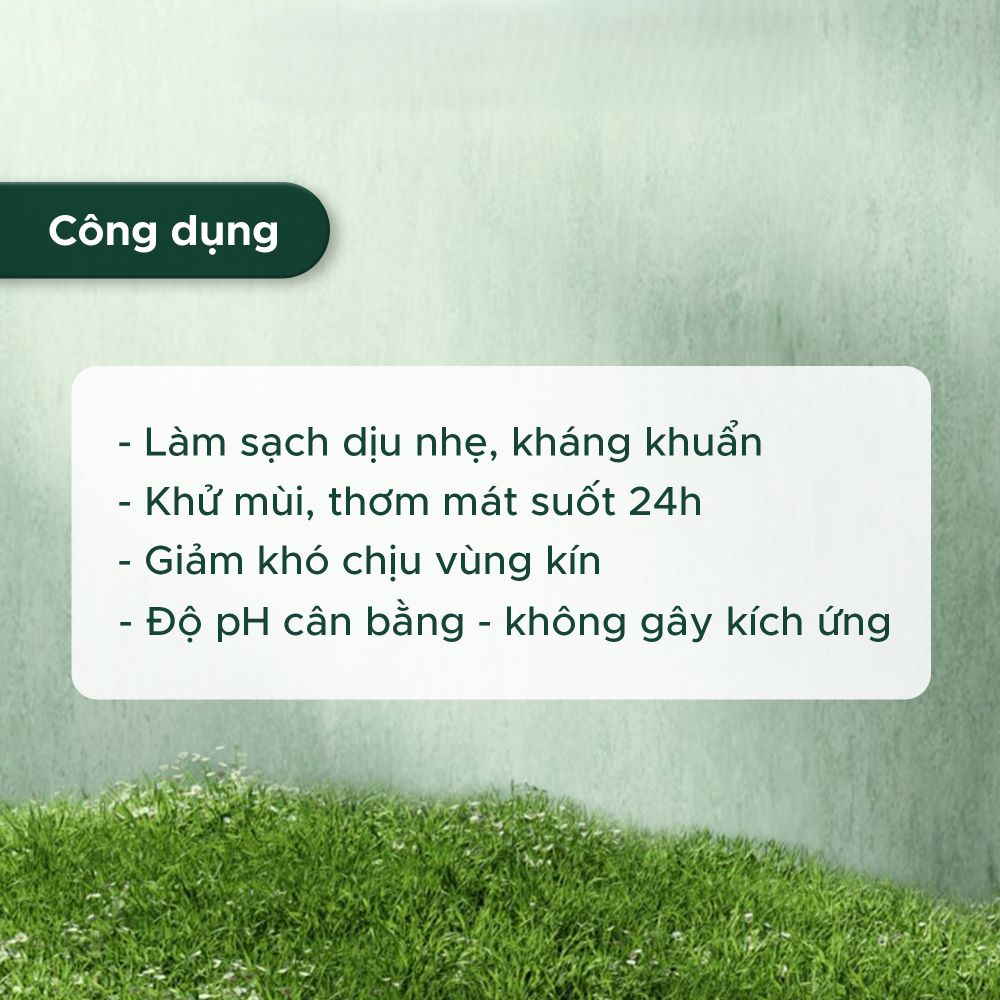 Làm sạch nhẹ nhàng, giúp khử mùi hôi và làm thơm vùng kín, tạo cảm giác thoải mái, khô thoáng suốt 24 giờ.